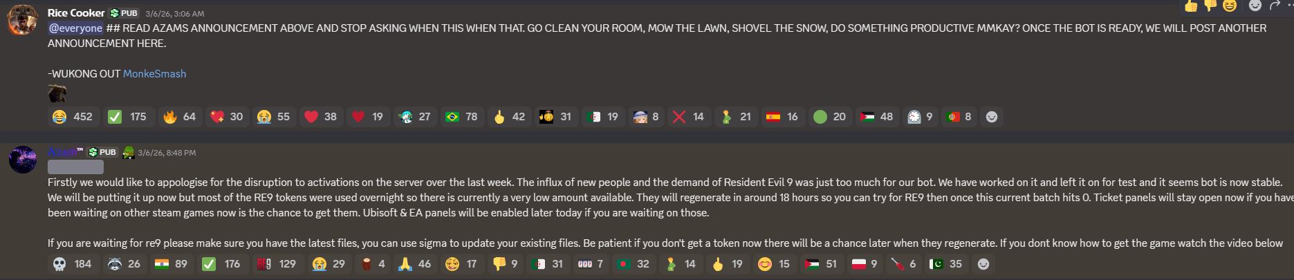 >>736654159maybe for the people that want to play RE9, or whatever super hyped game, on release day.But for the games i wanted to play (Daemonhunters, Shinobi, Khazan, BMwukong) i didnt have to wait a second or write to anybody other than the bot.It was seamless.I should check Crimson Desert too, but i feel that im better waiting on that game until it gets a few patches more.Thats another thing you get the most up to date version,Nothing against hypervisor, i'd use it 100% if offline activation wasn't a thing, but i just dont see the downside on this method.
