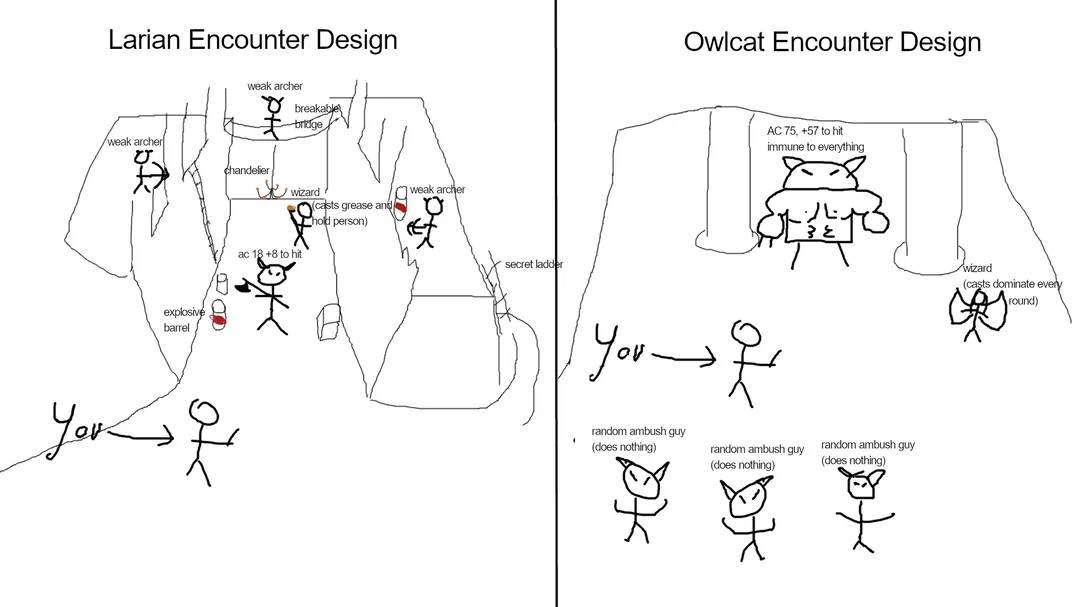 >>736659597>A boss should feel like a bossIn that case the right doesn't "mog". Owlcat's Pathfinder games do not have memorable bossfights, because they are over so quick. You get your guy next to the boss and inside a full attack, they oneshot him. Only exception was Nenio's questline Demon lord. Baphomet, Nocticula, Dreskari, etc. All die in one turn, despite playing on core.Larian's encounter design on the other hand is at least memorable. They avoid having filler trash mobs, instead having fights with interesting quirks. Like the scarecrow lady on fire in DOS2. Still remember that, despite it being like 6 years since I played that game.