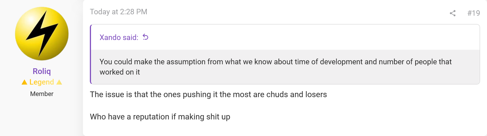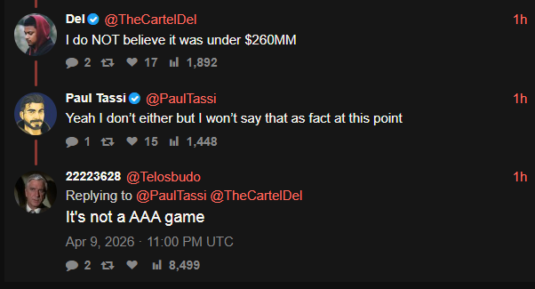 >>736708367Highguard was trying to be more experimental about 2 weeks before it got hit with the shutdown twitter post.>>736708468You can be accurate without having a proper source. Read my last post. He's making educated guesses without any specificity. Look at his recent statements regarding the cost of the game. He just says that it cost "more than 200 million". That is such a wide scope, it covers so many numbers. The real budget could be 201, 202, 203, etc. If he had said it cost 245million that would be more specific and therefore would make his source more valid.