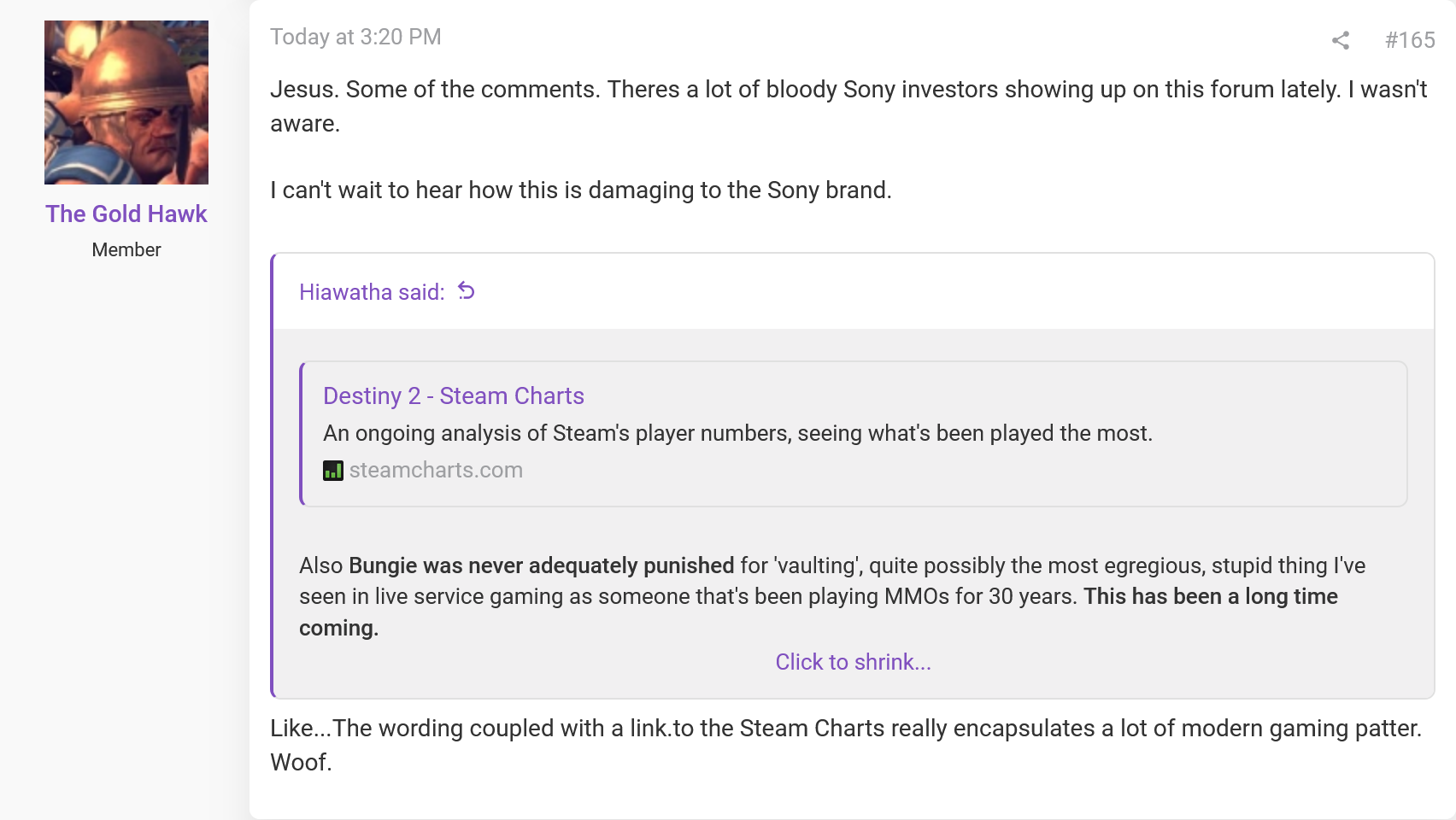 >>736687839>On Bungie’s end, there is less panic than when the game was flailing with multiple controversies last summer. They are mostly heads-down, working on new content, and whatever the case may be, this is not a game that is about to face some sort of imminent shutdown. And these days, that’s enough to qualify as a win.Article says the exact opposite but okay