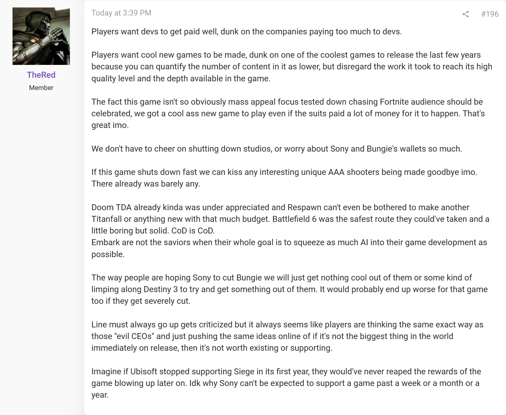 >>736688481So many different things>shat on the legacy of the original IP, alienating the old fanbase>sacrificed Destiny 2, alienating and embittering Bungie's current fanbase>multiple firings of higher ranking creative roles during dev period>blatant, high-profile plagiarism of the entire artstyle>target audience is exclusively turbosweats, so a small portion of an already niche and widely loathed genre>doubling down on exclusitivity with Ranked and Cryo archive >flipflopping on balance changes that harm the casual user and cater even more to "hardcore" extract gamers and streamers>hero shooter characters with little to no customization beyond premade skins>releasing after ARC Raiders and Tarkov already had a stranglehold on the wider playerbaseI cant think of a single thing that went right with this release