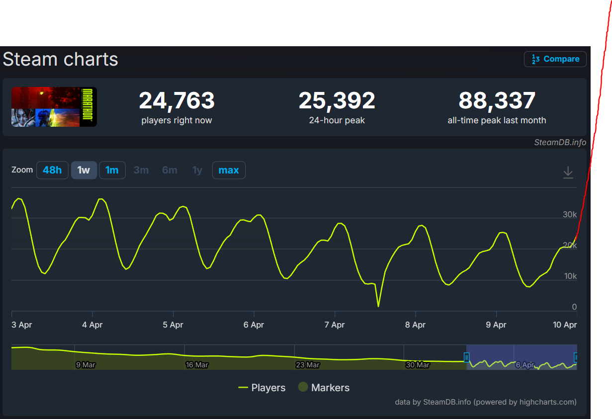 >>736688481arc raiders ate their lunch and the free beta basically poisoned people against their game. they have been consistently losing people since the server slam. the general public have rejected the game