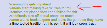 >community gets impatient>anons start making fake xci files to troll>tourists get pissed they keep falling for shit>redditards piss off actual anons so much>anon wants tourists gone and leaks the game so they leavea time tested tradition at this point, it will leak soon. trust
