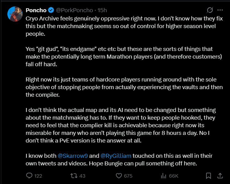>>736728316>genuinely, what exactly is the issue?1. All weapons are hitscan.2. "Bullet magnetism".3. Aim assist on controllers and consoles being effectively an aimbot.4. Inability to disable cross-play on PC.5. Inability to disable cross-play with PC users who use controllers to benefit from aim assist.6. Thermal scopes effective at all ranges, and not being affected by rain/fog/steam/environmental heat sources.7. Sound propagation (like being able to hear someone opening doors/containers) while being 30 feet outside.8. Spawn points being too close together, especially on Dire Marsh.9. Game being too rewarding for engaging in PvP and not sufficiently rewarding for engagement with PvE (xp values and faction progression).10. Visuals (moth eating 'pillars and such) being too repetitive.11. Blue colour during loading screen being too intense.12. Combination of visuals and music can give migraines.13. No epilepsy warning.14. Exceptionally unrewarding battlepass.15. No PvE mode.16. "Experimenting" with duo mode.17. Weekend availability of Cryo and ranked.18. BattlEye.19. Cheaters and hardware hacks.20. Inability to block players while in-game. You can only do that after you've completed the run and found their name in the "recent players" tab.There. 20 reasons.