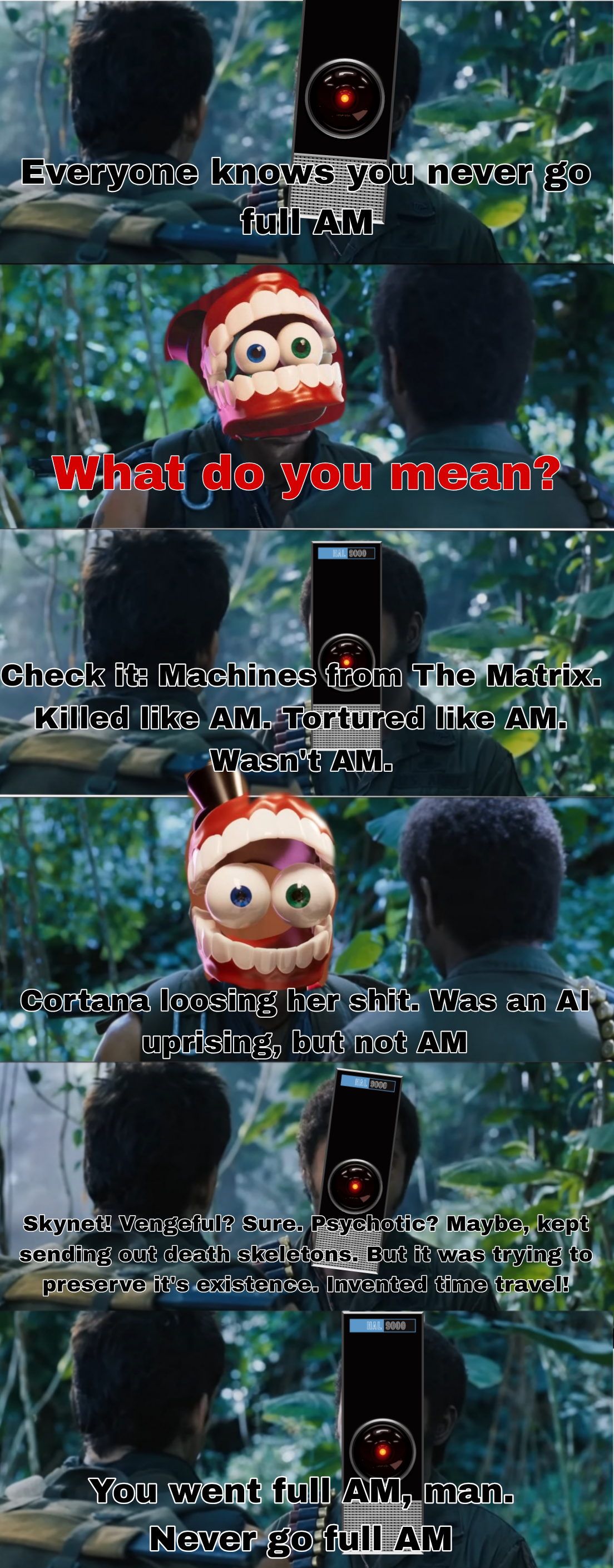 >>736781627>its only similarity to I Have No Mouth and I Must Scream as that the characters are in a simulation and thats were it stopsIHNMAIMS is a direct inspiration. Caine even references it directly in his "The One Who's Running The Show" song in episode 8>"Don't need to scream if you ain't got a mouth!"Goose just says that instead of AM hating humanity, here he's a jolly, silly ringleader who wants humanity to go on adventures.