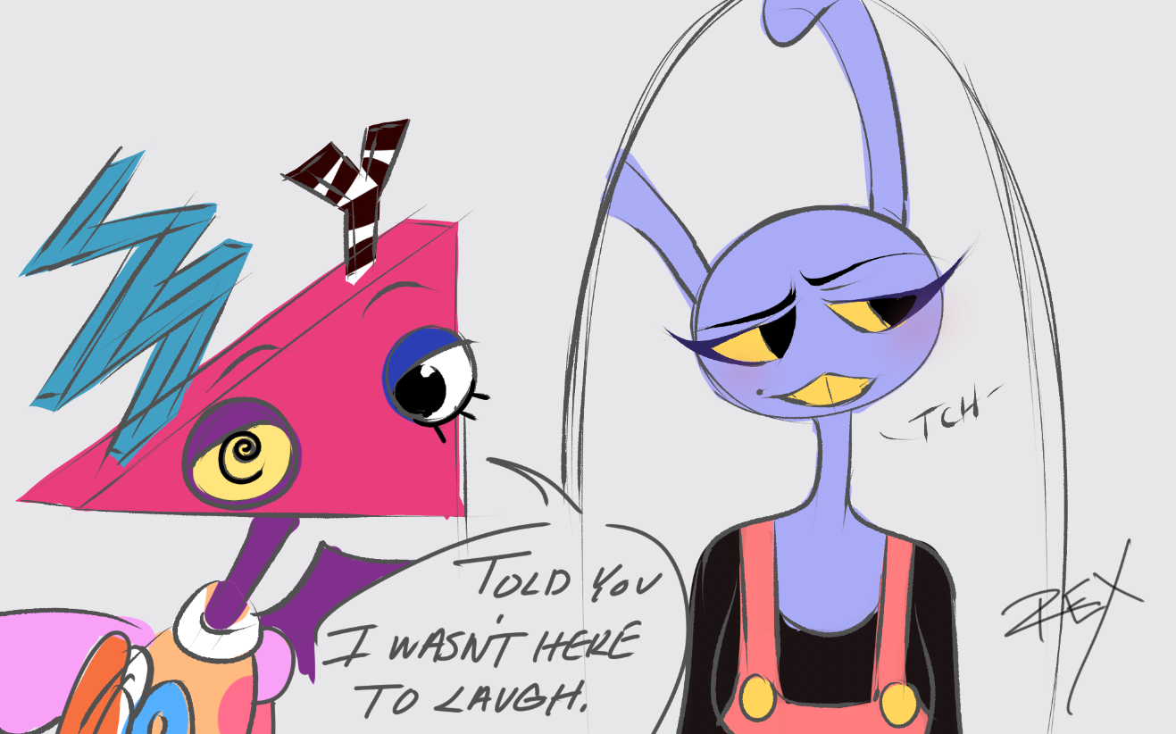 >>736784502Alright. Kinger is pretty straightforward, he's the king chesspiece, the last one to be taken during a game of chess, and the most important one. Here he's key to stopping Caine, and he serves as a positive role for Pomni and Ragatha when they feel things are breaking down around them and they can't take it anymore. He's also the oldest, not just within the Circus, but biologically too. He's 48, while everyone else is in their 20's or 30's. And his coping mechanism is insanity, feigned or otherwise. He has adapted to the Circus and takes things as they come, without really letting them get him down. Which is how he survived years on his own after the rest of his team, including his wife, abstracted and left him alone. Jax takes the avatar of a perpetually-grinning cartoon rabbit. It shows that he uses comedy and the goofy nature of the Circus to mask his own fear about leaving, and his despair at losing his friends to abstraction. His true self underneath the rabbit skin is a man, showing he doesn't want to go back and face reality for some reason. So he abuses other people because "it doesn't matter"; they're just cartoon people now. If he admitted that things are actually real he would have to face his despair that his friends Kaufmo and Ribbit were also real, and he lost them. He wears that grin for a similar reason to Ragatha; to use insincerity to protect himself from that despair. It's also why he's so aggressive to Ragatha, she reminds him of himself, and he doesn't want to face that.