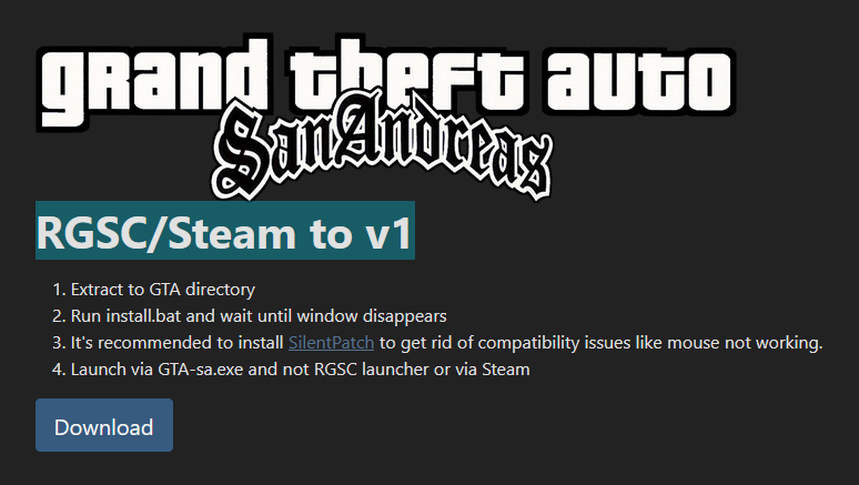 >>736752863install san andreas, if you're using a steam copy, then copy the folder somewhere else or rename it to something else so steam doesn't mess with the filesuse a downgrader (picrel) to make it version 1.0. just run the batch file it comes with.don't right click > run as administrator, that didn't work for me. run it normally and a command prompt window will open and it'll take about a minute or so.http://downgraders.rockstarvision.com/then download the mod and extract it over your downgraded copy folderhttps://www.moddb.com/mods/gta-carcer-city/downloads/gta-carcer-city-demotake note of the folder structure. open the "GTA Carcer City Demo" subfolder inside the zip file and drag those contents ex: text\ scripts\ movies\ etc. alongside the existing ones. don't make a big subfolder with all the mod files inside of it, that won't work.there is an Optionals\ folder that comes with the mod that has its own readme file. those are for if you need vulkan rendering, forced windowed mode or want to use the trainer to dick around