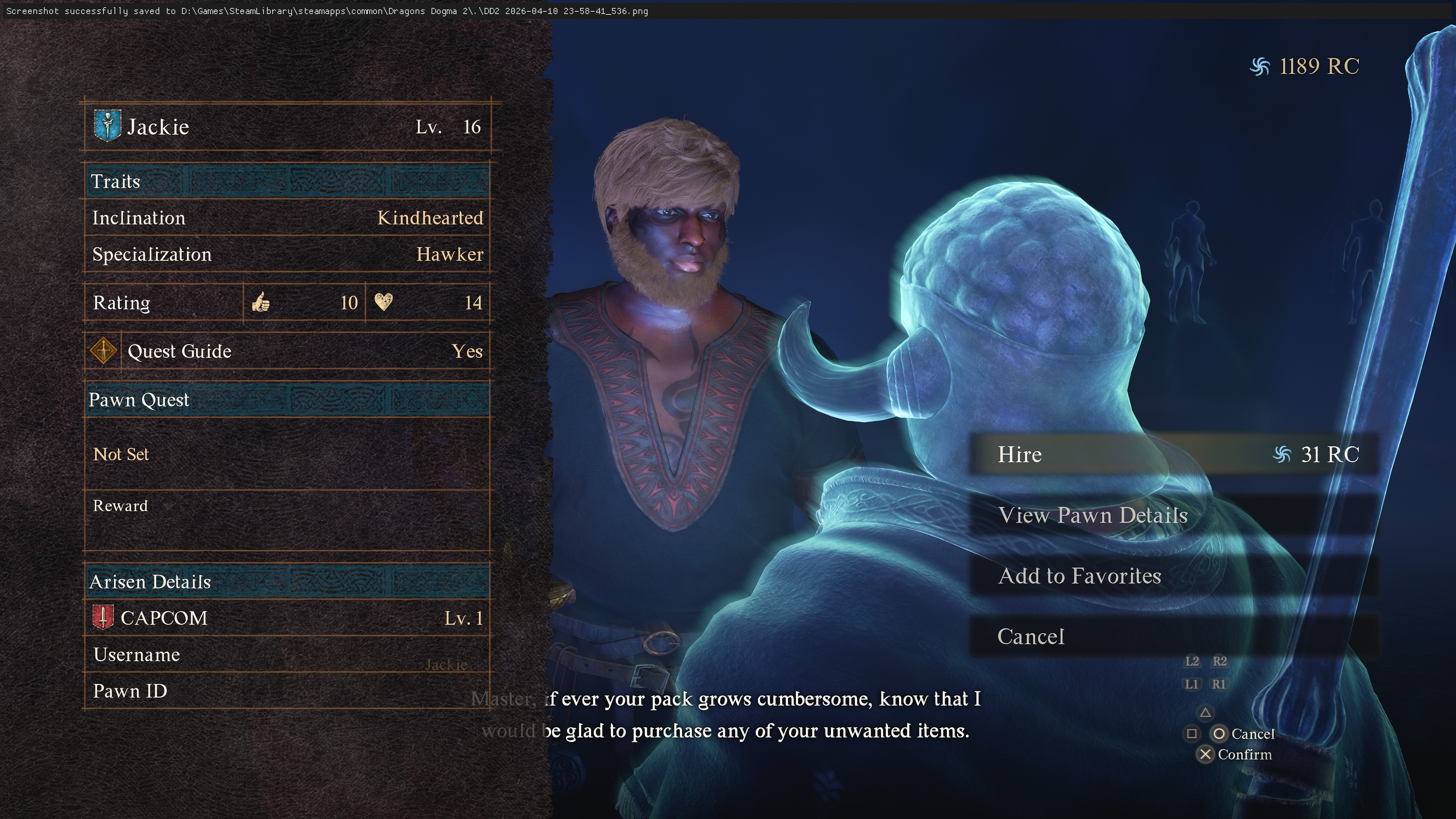 >>736779646>DD2>PC>pawn name: Bishop>pawn level: 100~110>pawn vocation: mage currently>Asperity to get a silence from the staff and the one that preserves degradable items longer.I really like my pawn. It just made sense for a Fighter Arisen and it worked well for my story. It's my favorite combo