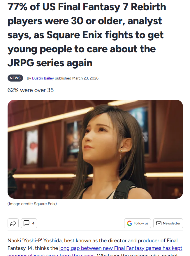 >>736753680>Square's been dead longer than zoomers aliveI just don't think the 40-something fanbase will be catered too any longer. I think we're already there and moving forward, most games will be for the younger players. Which is sad!!!