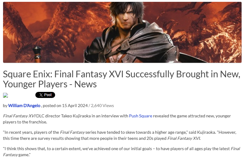 >>736752109I’m 28. The first and for a long time only FF game I had played was X I had a crush on Yuna as a kid. After that I got into FFXIV around Heavensward and that caused me to go back over the years and I’ve played the entire series at this point. Some games multiple times in fact. I know other people my age and younger who have done the same thing, but all of them were also XIV players and that’s really been the only real way to get into the series these days. The old games are mostly great (IX is my favorite game in the series actually), but the games from XIII onwards have mostly been mediocre to bad. That’s why young people don’t care.