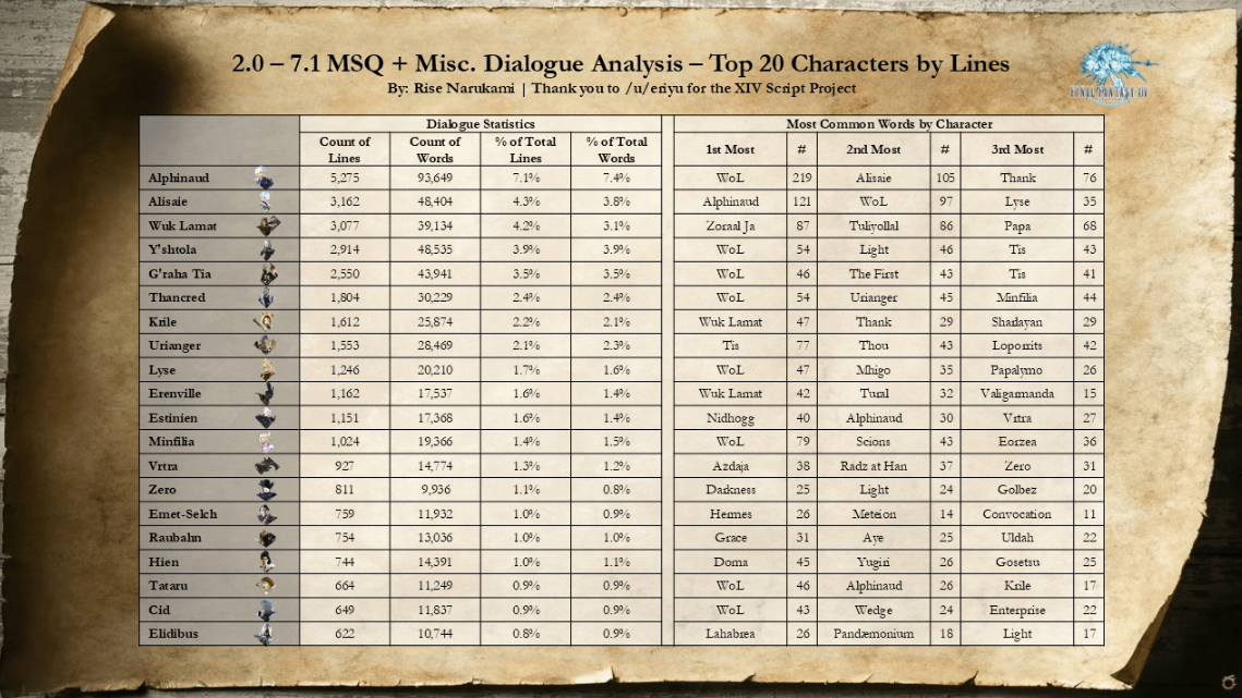 >>736784874>Wuk LamatI don't really like piling more hate onto DT since everyone knows it was a dumpster fire but its fucking crazy that a character who existed for 1/6 of the games 12 year lifespan has more lines than a character who is arguably the face of the entire MMO