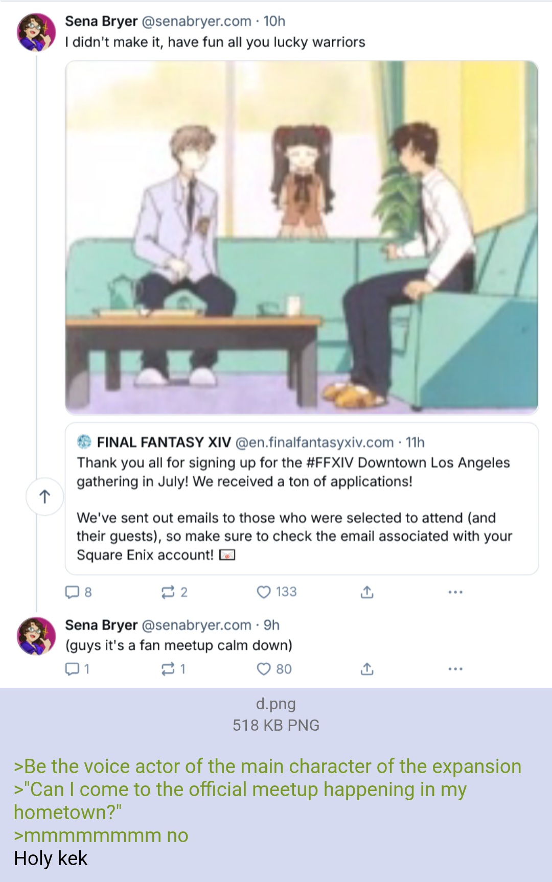 >>736831174>"Well I guess I don't need to buy 8.0. Thanks, I guess."I honestly wouldn't care. FFXIV needs to win me back. I'm still going to buy 8.0 at this moment, but if they do anything to make me think they haven't learned their lesson I won't and they'll just be dead to me