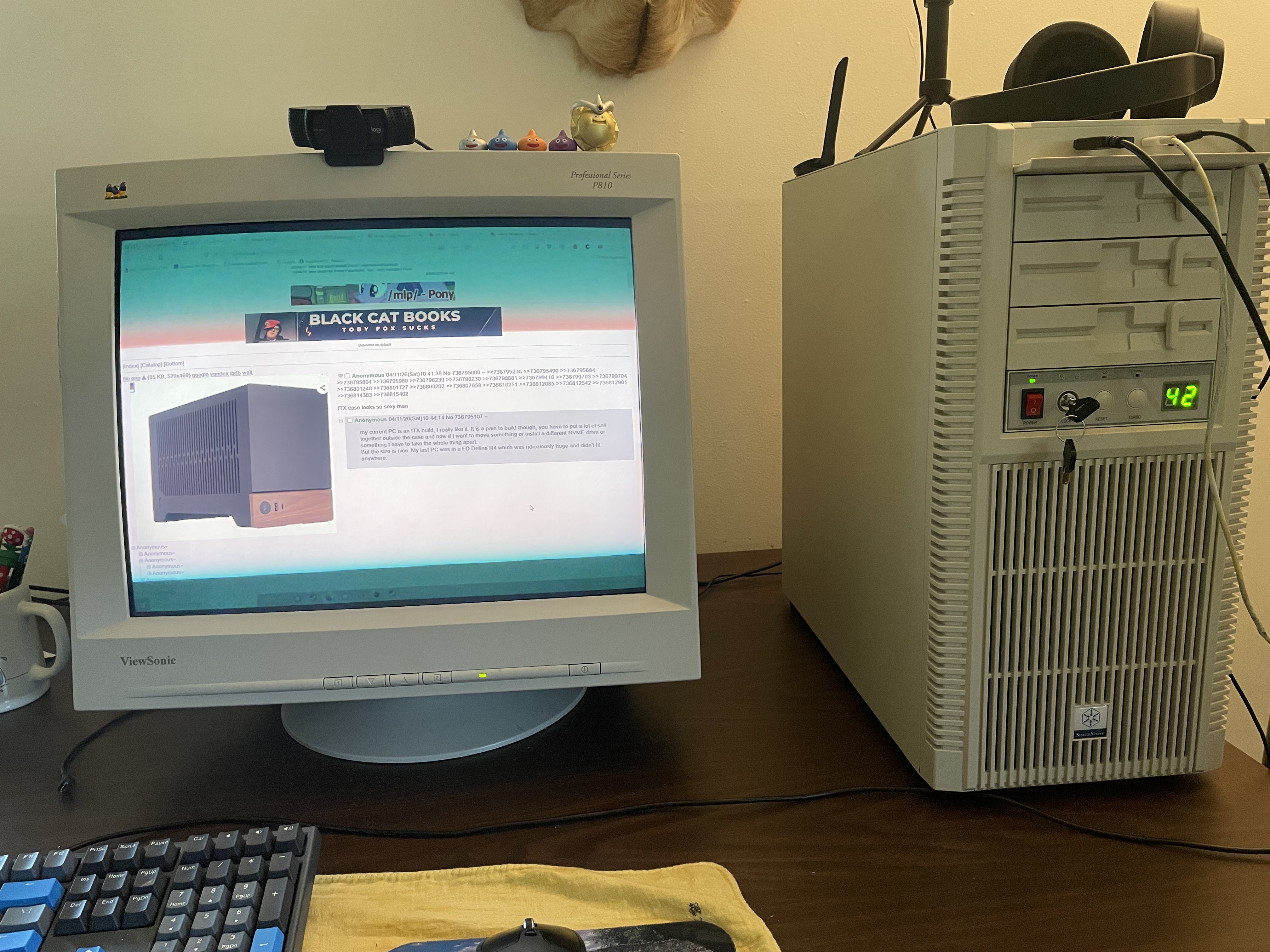 >>736795472I was contemplating a mini itx build simply so that I had a case with the gpu not sagging in a socket inevitably destroying the card/socket in use. sure, there's the argument of "just lay your pc case on its side then" but i have concerns about hard drive life when sitting at a different orientation than what it's been at for years.I was also considering designing and getting a case fabricated, but there's a whole bunch of shit involved for that too. Or I'd like one of these ancient ass japanese cases.