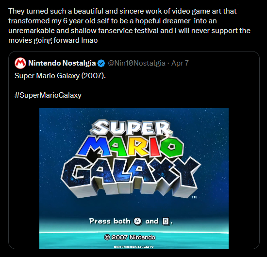 >>736798276>Nintendo fans brag about how Mario Galaxy is so highly rated and sold so well, treating it as one of Nintendo's gold standard games>people criticize the junk food movie that used its name but hardly adapted it at all>suddenly "it's just a game why do you caaaaaare"
