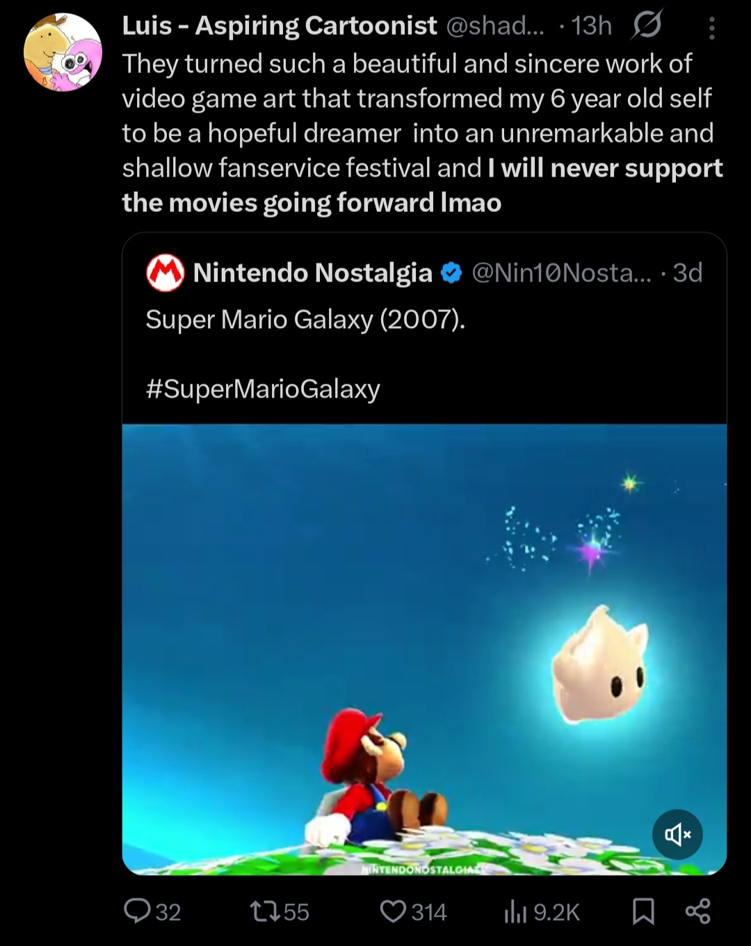 >>736809385>The Quiet Sadness of Super Mario GalaxyWhoever originally worded that take is a faggot, but SMG does have a majestic quality on top of being a bing bing wahoo-fest. The whole Little Prince-aesthetic is rarely seen in games and fits Mario perfectly, and getting rid of that majesty for the movie makes no sense.