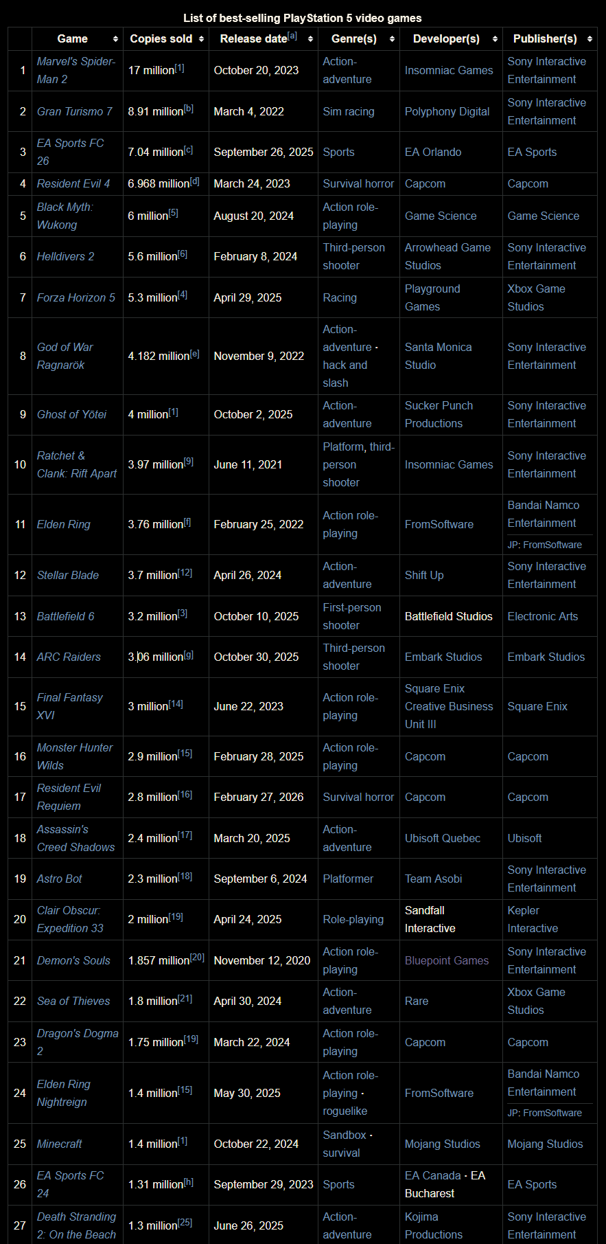 >>736823074>what? How did Forza sell so much on PS5? Or is the sales number made of every platform?Wiki editors are trash. Some of them incorrectly include multiplat sales: https://en.wikipedia.org/wiki/List_of_best-selling_PlayStation_5_video_games#cite_note-Steam_wish-7Luckily there are citations so you can check yourself. Not all of them do though, like Jewden Ring.