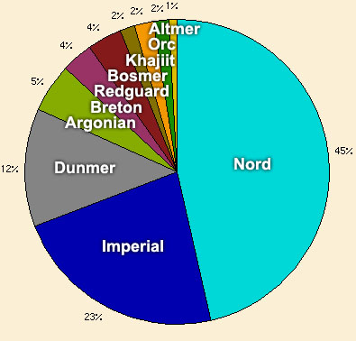 Funny how it's nearly identical to the nordic population percentage of Bloodmoon/third era Solstheimhttps://en.uesp.net/wiki/General:Demographics