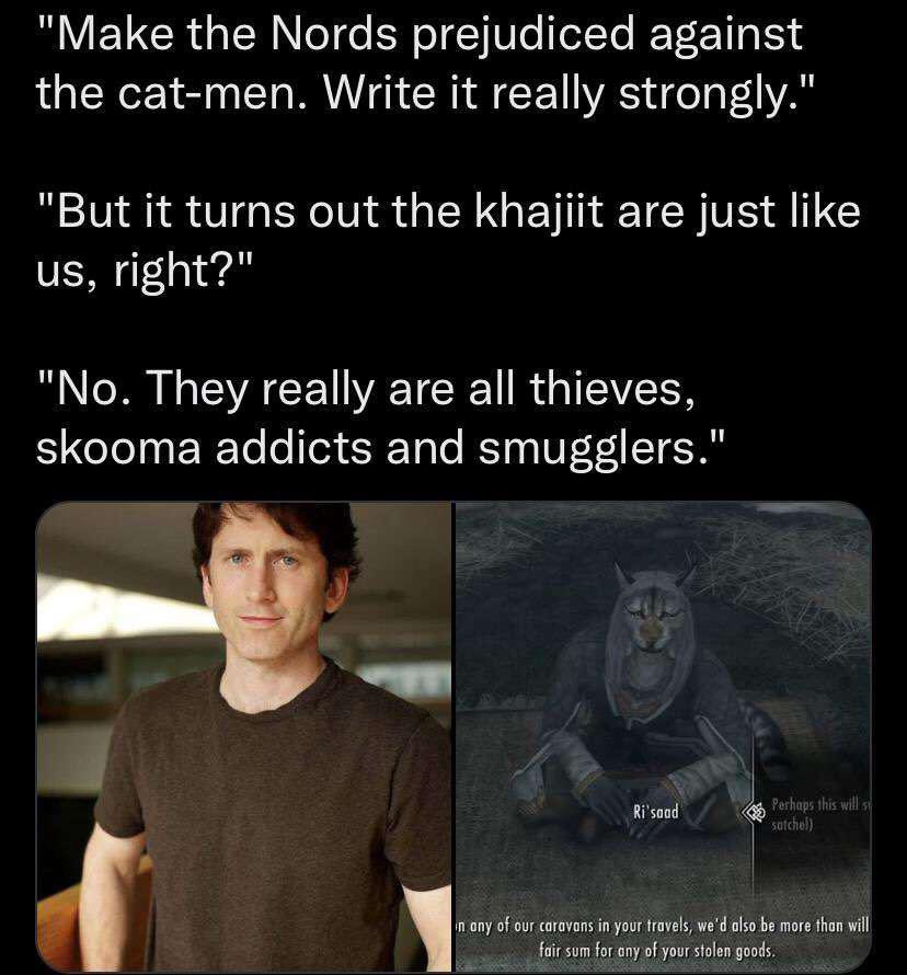 >>736805940>>736806186Instead of romefags vs viking fags it should have been nationalists vs internationalistsThe imperial legion and legion controlled cities should be where all the diversity is. Instead of their army being all imperials like in game it should be a mix of everything. Redguards, imperials, orcs, a few mer, and the occasional argonian or khajit. Khajit caravans should avoid stormcloak territory because of persecution and their dungeons should be full of non nordsInstead I feel like windhelm and riften are indistinguishable from solitude when they should be vastly different