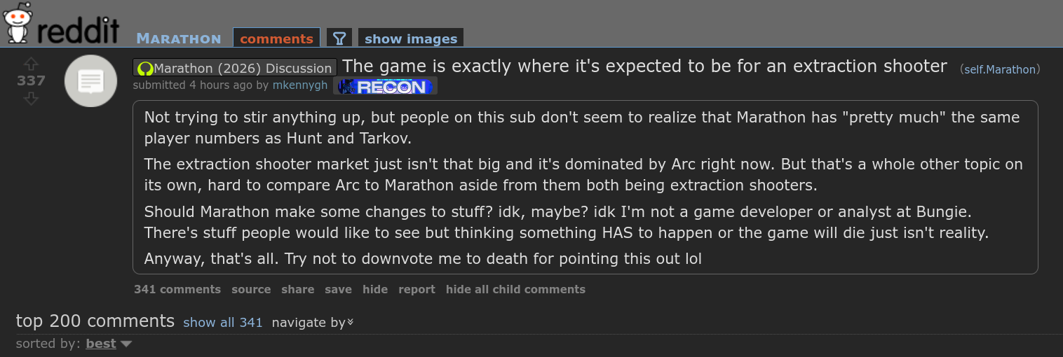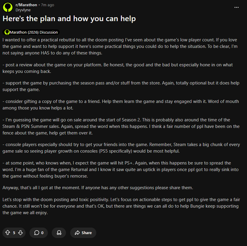 Man, just a couple of months ago all the discourse around this game was all Marathon vs. Arc Raiders. Now the discourse is about whether it's going to survive the next month or not.