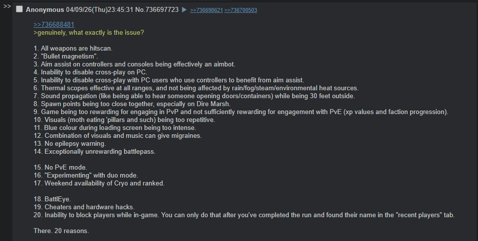 >>736803746>Design an entire game around requiring to be part of a coordinated 3 man discord team and having a 2nd monitor for having a youtube video to explain how to solve purposely obtuse cryptic puzzles with zero in game explanation and a community made map site to show all the pre-positioned spawn points and possible extract sites that the game doesn't show itselfEver since Destiny 1 Bungie's been stuck in this mindset of needing to shove MMO mechanics in their FPS. That shit should have staid exclusive to the Destiny series, Marathon reboot should have been it's own thing. The current end game is basically fighting inside a tiny "puzzle" filled PvP arena with the ultimate goal of trying to fight an MMO raid boss in an extraction shooter setting where "solving" the puzzles require you to grind RNG items in other maps before risking your gear in this one. If you join a random team who don't know what's going on and didn't grind those keys, part of the map is simply locked out for you.The current playerbase is eating itself if you look at the leddit threads. All the casuals left and now the semi-hardcore players are getting farmed by the no lifers and cheaters until they're gone too and the next rung of try hards get farmed.
