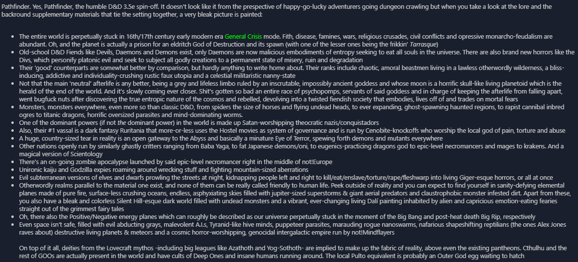 >>736818360I know jack shit about golarion, but I know that there's a series of campaigns that deal with this ultra powerful lich that seems sick as hell.One of them takes place somewhere called "the last wall"?