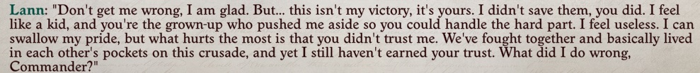>About to face an enemy that I have already bested several times>Got mythic powers spilling out of my pants>Can easily whipe the floor with him and all his minions, solo>Lann, with his 8 INT comes up with a retarded suicidal plan to trick Savamalamalekum instead of just walking oer and punching him in his face>Tell him to fuck off, and that I got this>Cries like a baby that I didn't trust himIf it wasn't for all the nigger companions, Lann would be the worst, by a huge margin.