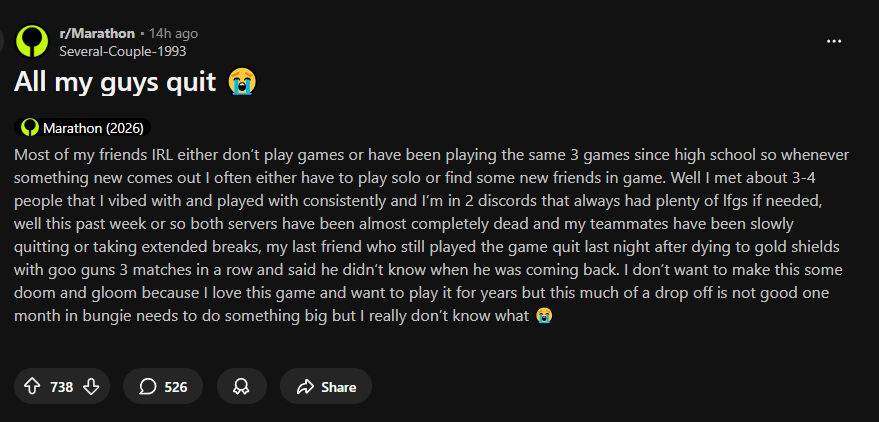 Reminder Bungie got bent over hard after Destiny content they released (sold over 5x what Marathon did btw) underperformed