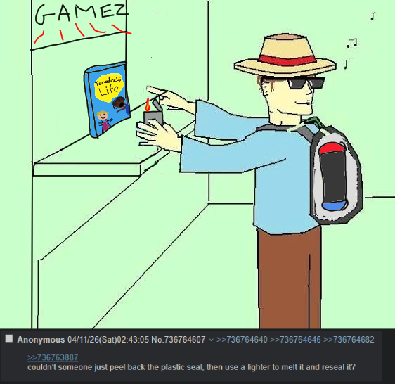 >>736818001You're right, all this talk about some Braylin and a shitty discord server distracted us from the only real way to get a copyREMEMBER THE PLAN:>Grab game off shelf>Put in cart with other items you intend to buy>Find spot where cameras aren't watching>Shove gamebox in jacket, preferrably under shirt while wearing your jacket>Head to bathroom>Cameras are active near bathrooms>Go in>Unwrap>Take out cartridge>Put in shoe or other pocket>Re-seal game with lighter>People will think you're just ripping fat ass in there anyway, no one's gonna try to distinguish shit from plastic in a bathroom>Put case back in shirt>Go back to where you know the cameras aren't looking>Put game back in cart>Go back to shelves>Put it in some random shelf, wagies don't really care, they'll just clean it up at the end of the day>Check out>Walk out free as fuck