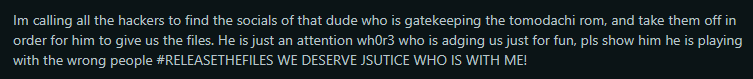i'm tired bro can someone just get nintendo subpoena beat's twitter and copyright them for this shitin a situation like this a normal person would be like "Maybe, I should leak the ROM because I'm getting harassed and everyone will get off my back?"noyou complain on fucking twitter on your private accountactually the worst leak season ever this is the worst