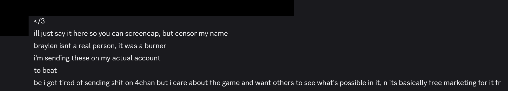 Dear Braylen:I am terminally ill with testicular cancer, and I will be dying in the next 72 hours. Please could you leak the game so I could play it. It's my last wish.I'd appreciate it, as I believe you are a kind soul that could still do good in the world. Also, I got approval from Make A Wish, I can get them to speak to you too, just let me know.Thanks,Your Biggest Fan.