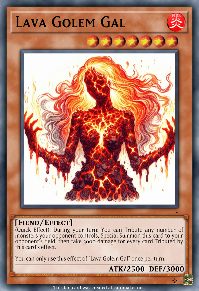 >>736840170Lava Golem eats up your Normal Summon if you use it. Meanwhile this custom ass card gives you the chance to negate its effect and doesn't require exactly two.