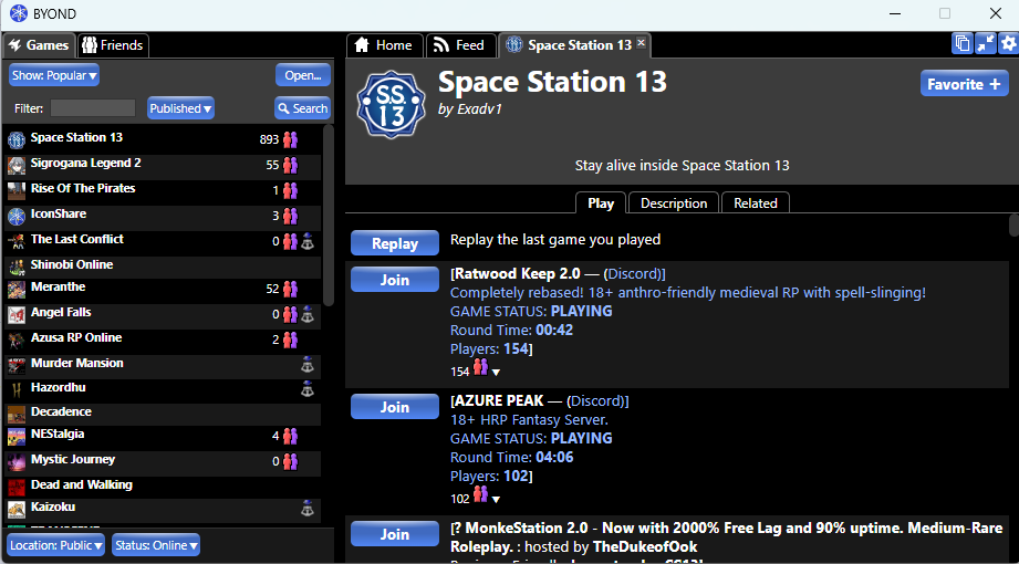 >>736841429it's a very fun 2d medieval mmo rpg where the world resets every 2-3 hours. the currently most populated server from the byond engine launcher.