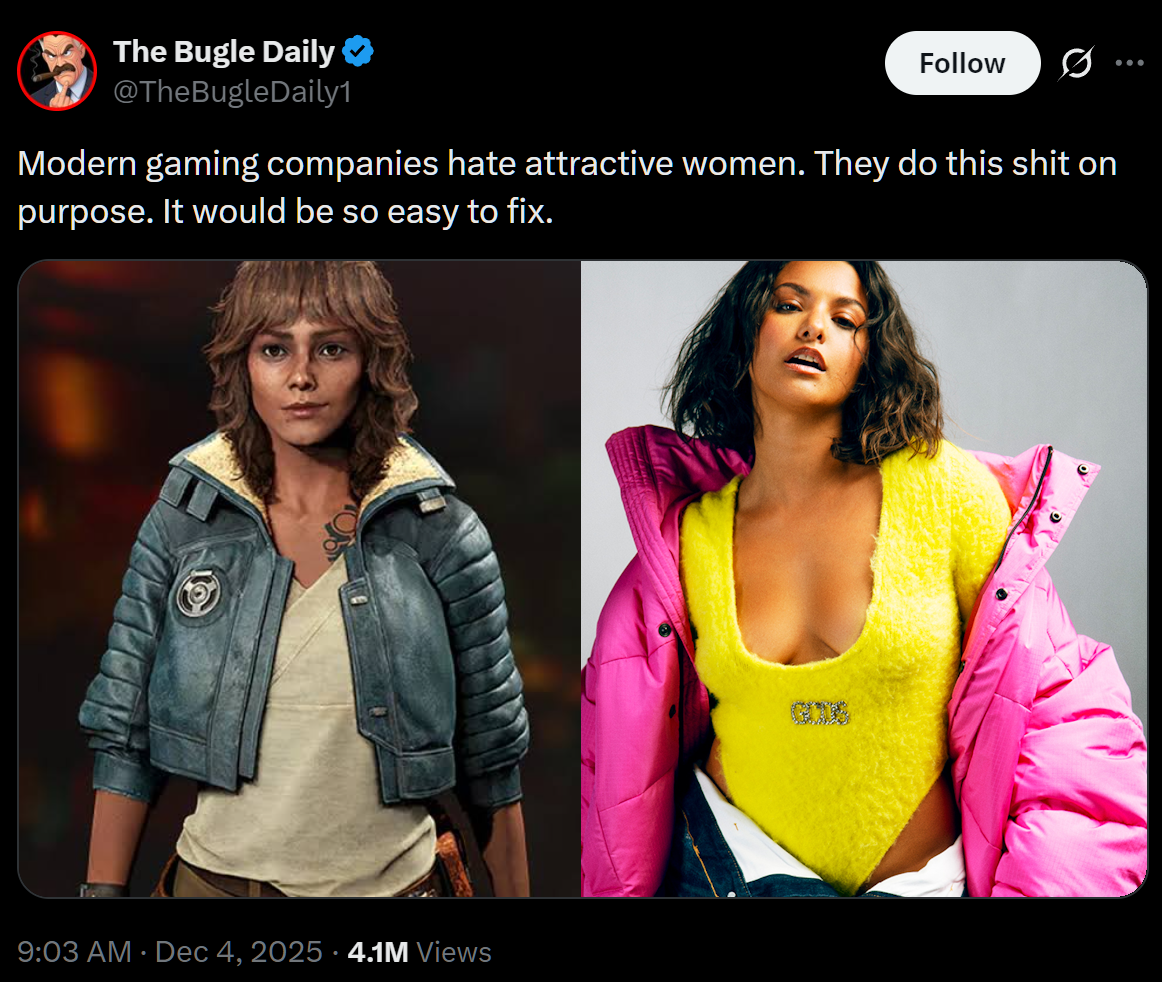 >>736850214Pay attention, smoothbrain.Guys in video games are flawlessly recreated from 9/10+ male actors, and often beefed up even more for women's attention.Then for some stupid reason women have their faces mutilated despite the facescans being from hot chicks. Then made even more retarded looking by flattening their breasts/asses.There's an obvious double standard here and it's not in men's favor.
