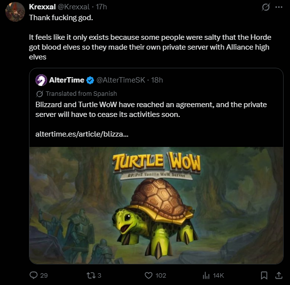 >Twow dead>Epoch dead>BB deadBlizzard must be working on ACTUAL classic+ (not sod bullshit) if they hate private+ servers so much