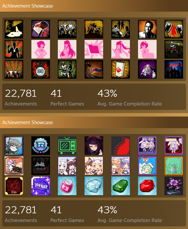 >>736860978Nah, it's more just that I have a lot of visual novels that have "achievements" for just going through the linear story. The actual perfects I consider impressive were L4D2, Binding of Isaac: Rebirth, and Sonic Racing: CrossWorlds.