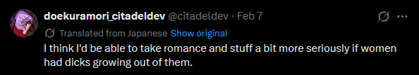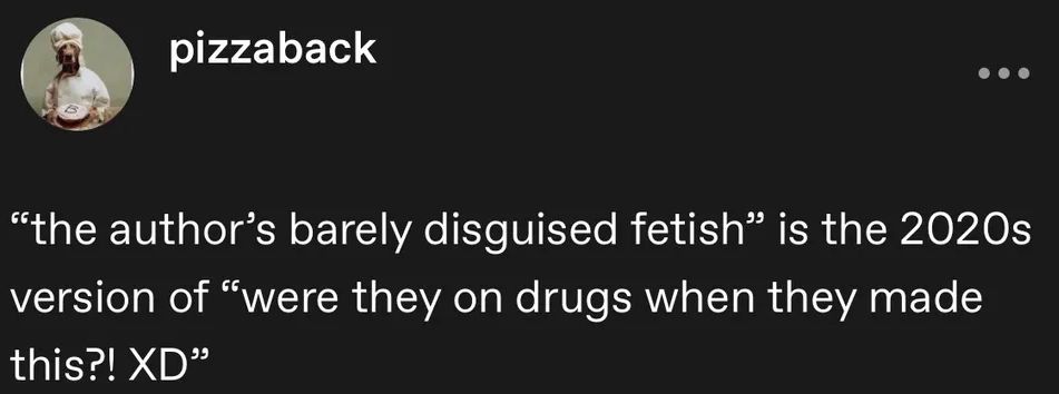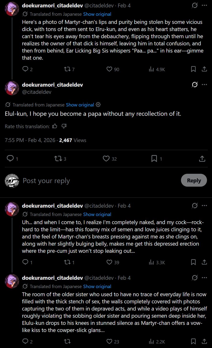 People got so caught up on the gore that they thought that was the devs primary fetish instead of the shotadom stuff he actually fucking froths over.A brilliant smokescreen.