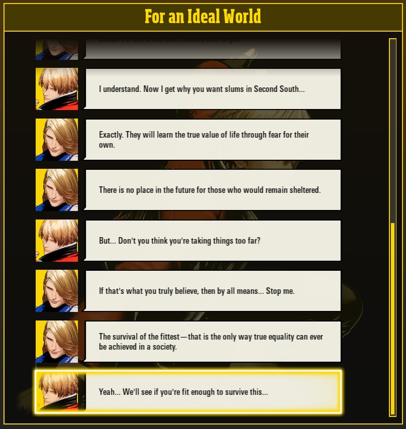 >>736893332>how they removed the any stakes the story might have had by making every evil or even slightly edgy character a misunderstood altruist.Unless I misunderstood the endings, I don't think every character is good now.>Freeman is still out there murdering and kidnapping people>Kain was never really evil, even back in MotW he was all about just saving his sister.>Mr. Big is still a crime lord that's holding Rock's mom hostage and he fucking dies via suicide bombing>Geese is still a dickhead that has more fond memories of Billy than his own son. He does feel pride about Rock being strong, but still doesn't give a fuck about him beyond that.>Krauser is TBDThat being said, they probably made most of the endings so positive because we're probably never ever going to get another Fatal Fury game after this, so better to make sure that everyone's story gets properly wrapped up.