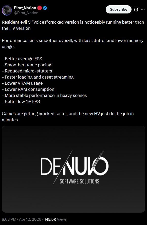 Never knew IGN of all place also writing this.https://www.ign.com/articles/resident-evil-requiem-denuvo-drm-fully-cracked-making-it-the-first-2026-game-to-have-its-copy-protection-bypassed