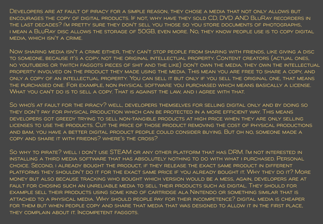 >>736868176Yes. Massive troon-screeds in NFOs, attempting to cultivate some sort of tranny sex cult and other brain damage ('erusa'). However all of that is obnoxious, but not nearly as bad as taking money to crack and letting patreon users who donate fucking $500 to pick the next game or some shit. The scene had 40 fucking years of keeping that shit, and a whole bunch of other garbage isolated and anathema and a handful of P2P zoomers on a russian forum start fucking everything up in less than a decade; its just like having to go to some goddamn discord server and find a token or some shit. The worst thing is that a lot of it has turned inward and profiteering unlike how in the old days not only was there avoidance of legal ramifications by not accepting money for cracking, but the various groups competed legitimately through PROPERing each other, but all worked together against invasive copy protection bullshit and passed down their knowledge in reputable channels.