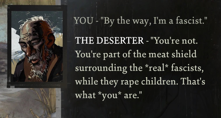 >>736872793>the player is always called a bad person for by the tragically heroic deserter for not being communist enoughAnother day, another anon who felt personally insulted by a video game...