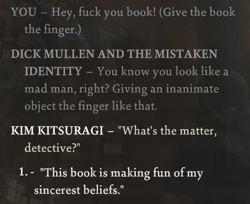 >>736865813I enjoyed playing as a fascist and calling Kim a yellow monkey fucker but I really don't get why so many people treat this game as if its writing is on par on with Planescape or jap VNs. It's funny, at least I'll give it that. Failing checks always ends up with pretty entertaining dialogue.