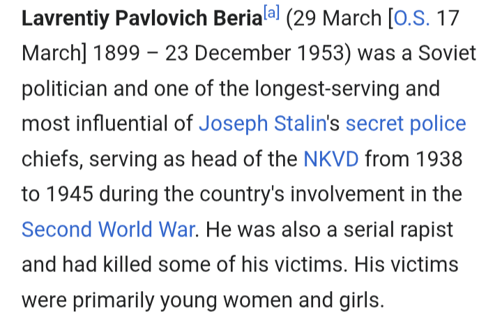>>736886858What Beria did wasn't even a "pizza party". He legitimately just used the secret police to fuck women and girls he saw on the street or wanted favours from him (which he wouldn't even carry through with). He asked his bodyguard to keep a record of every woman he's done it with as a form of blackmail only for a copy of it to be saved and used as a case against him during his arrests which were in the triple digits.
