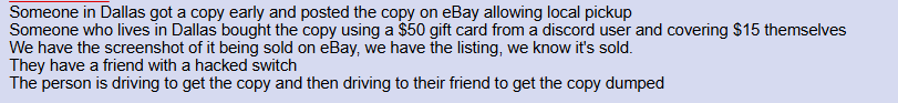 >>736866929Someone in Dallas got a copy early and posted the copy on eBay allowing local pickupSomeone who lives in Dallas bought the copy using a $50 gift card from a discord user and covering $15 themselves We have the screenshot of it being sold on eBay, we have the listing, we know it's sold.They have a friend with a hacked switchThe person is driving to get the copy and then driving to their friend to get the copy dumped
