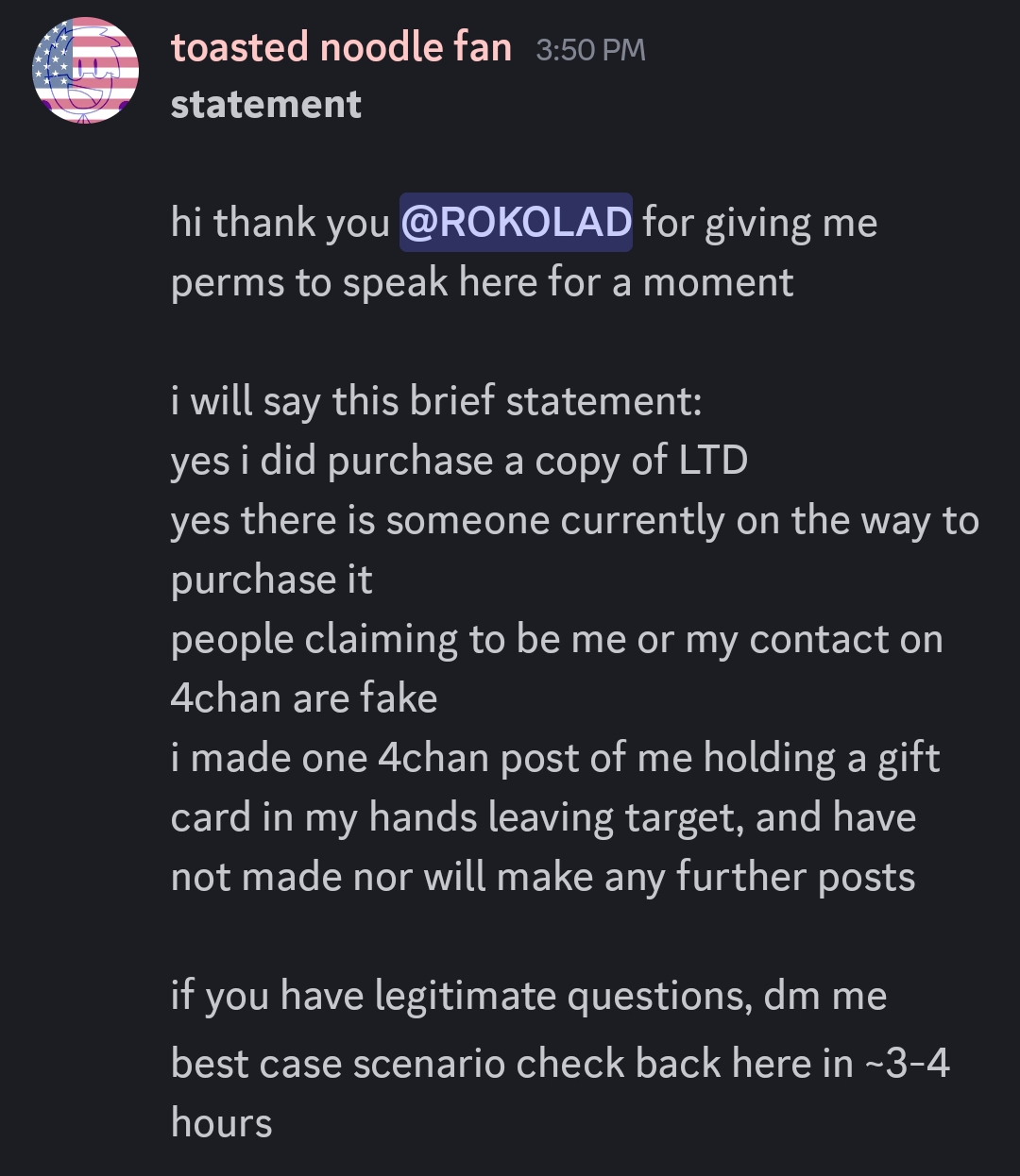 >>736867097THIS IS BASICALLY IT, ONLY THE DISCORD USER PAID FOR IT FOR THE PERSON IN DALLAS TO BUY IT.