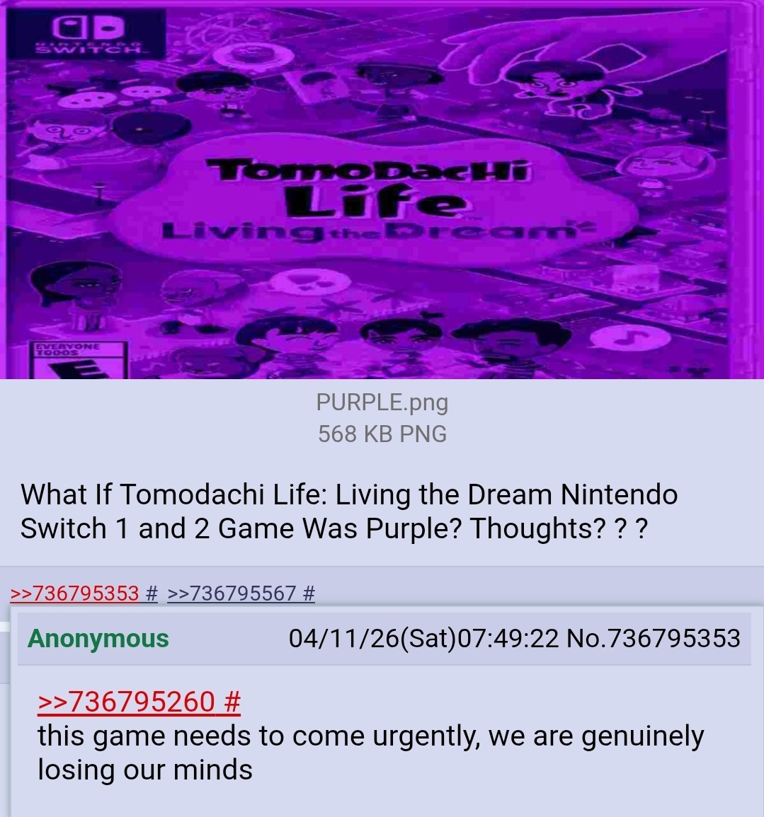 >>736866827Tomodachi Life: Living the Dream is a Switch game that's releasing on the 16th, but some retailers got early copies, and there's been a big hubub over people trying to get their hands on one and review it before it officially releases.