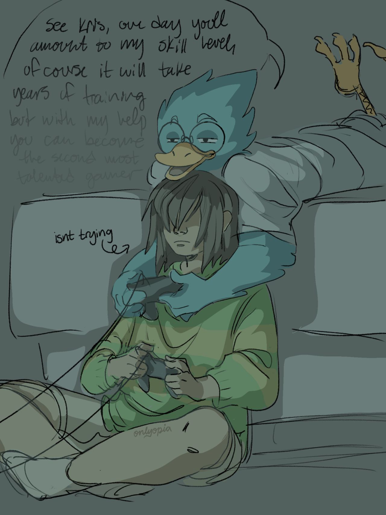 Wholesome scene of Deltarune Yellow Martlet bathing with Cole.https://files.catbox.moe/le8ckp.png