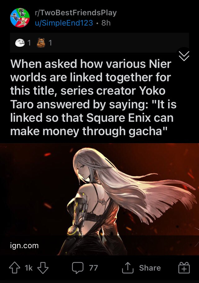 >Nierbros don't let Sqeenix EOS a valuable part of the Nier IP just because Sqeenix is a shitty greedy cashgrabbing gacha company