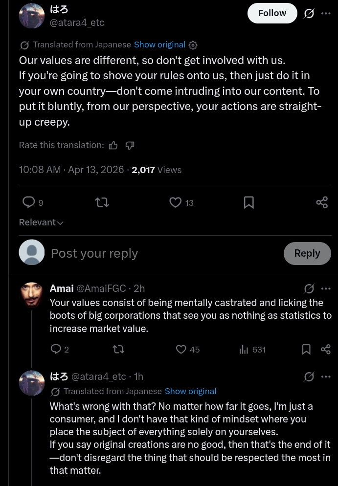 I don't live in Japan, so I have no reason to follow their moral code just because it happens to be their work I'm engaging with. I'm not Japanese. I am a foreign spectator. We will never have the same perspective on the art they create. The western otaku is born from western ideals.