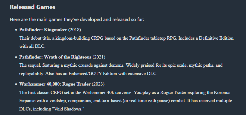 >>736914846For me its the wasted potential.Kingmaker was a super impressive and ambitious game for their first rpg but was heavily flawed (buggy, bloated, obviously unfinished late game).They then proceeded to make more games with the exact same flaws over and over while also jewing you with crappy dlc and breaking shit with every update.