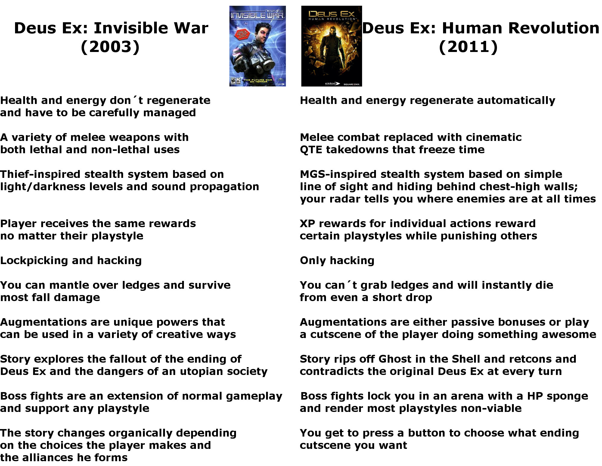 >>736917121Human Revolution is pretty much DE1 but with better gameplay. The same globetrotting, better storytelling, voice acting and soundtrack, better aesthetics too, no gamebreaking bullshit like the Dragon Sword, much better boss fights etc etc. It's an indirect remake if you think about it. Shame MD decided to drop the travelling aspect, 90% of that one is just the same looking Prague streets. And that fucking train cutscene...